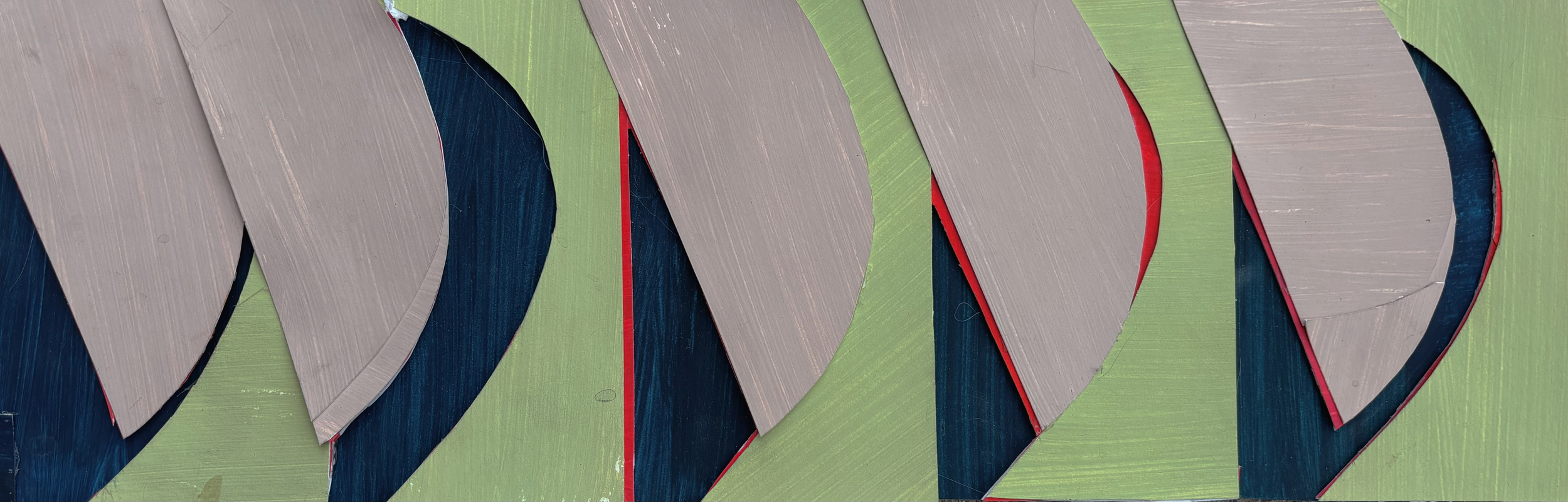 Babes in Arms, acrylic gouache on canvas, 48 x 60 inches, 2025; Rest, acrylic gouache painted-paper collage, 8 x 13 inches, 2025; That’s Dancing! acrylic gouache painted-paper collage, 10 x 19 inches, 2025; Bow, acrylic gouache painted-paper collage, 4 x 9 inches, 2025; Still life, acrylic gouache painted-paper collage, 12 x 15 inches, 2025; Untitled, acrylic gouache painted-paper collage, 6 x 18 inches, 2025; Strike up the Band, acrylic gouache painted-paper collage, 13 x 15 inches, 2025